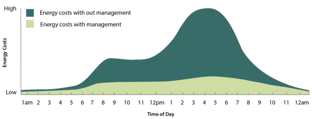 This graph depicts the potential impact of a Home Energy Management System that would leverage solar energy and home batteries to avoid high energy costs. This particular system would be for someone who wants their home energy to be powered by the lowest cost, cleanest energy source available at all times.